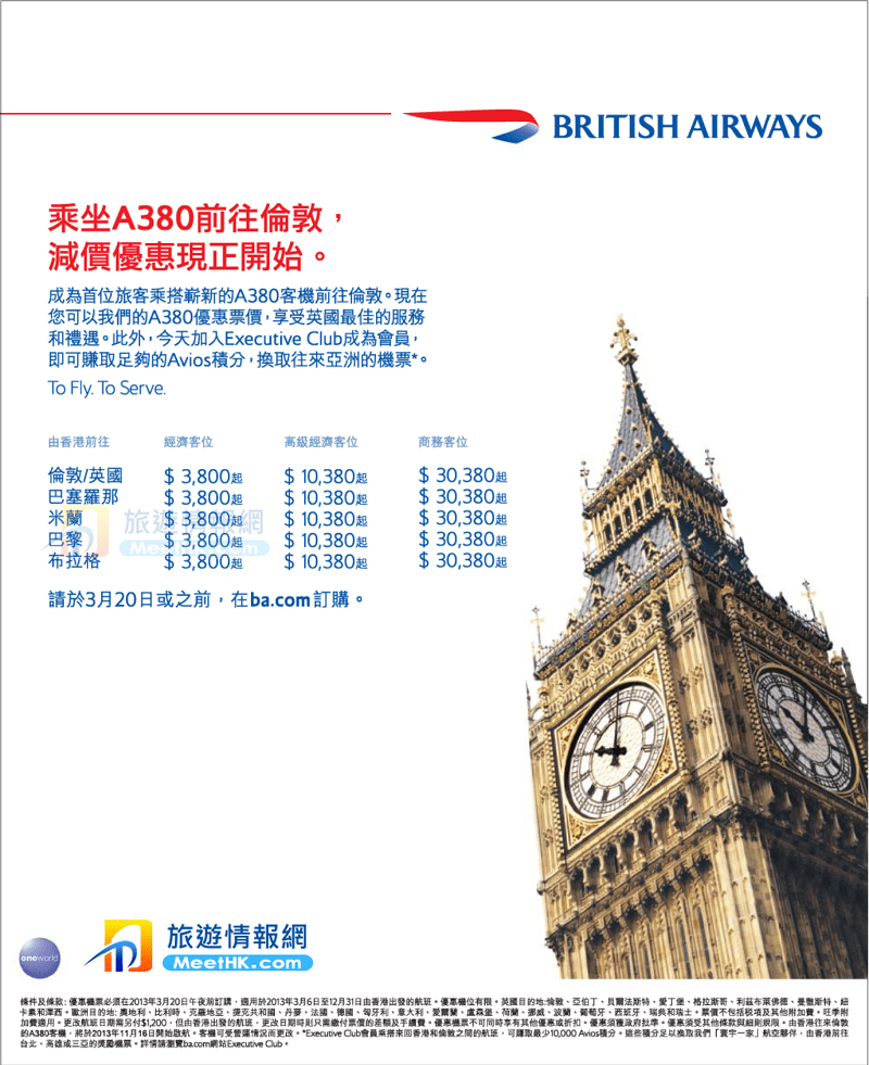 12月31日前出發!搭全新A380!香港往返倫敦及歐洲其他城市只需$3,800 – 英國航空 (優惠至3月20日)