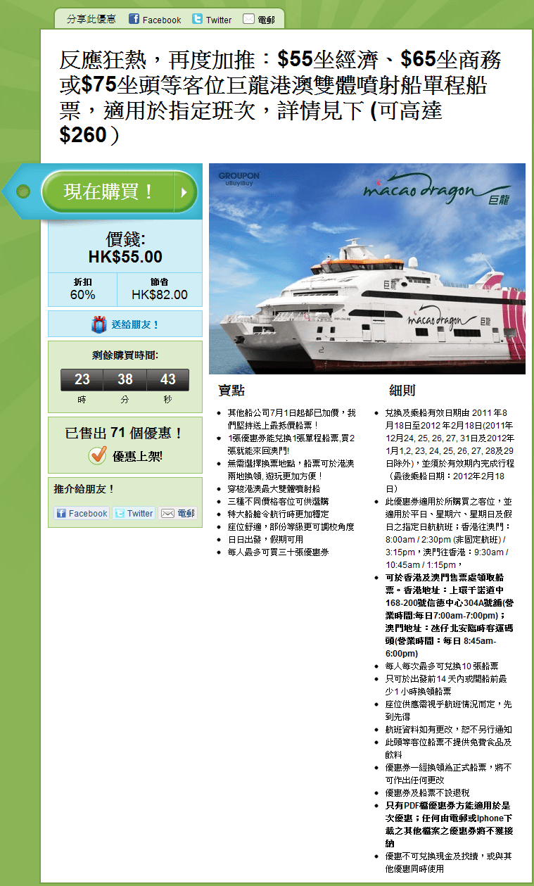 反應狂熱,再度加推:$55坐經濟、$65坐商務或$75坐頭等客位巨龍港澳雙體噴射船單程船票 – GROUPON (至8月15日11:59pm)