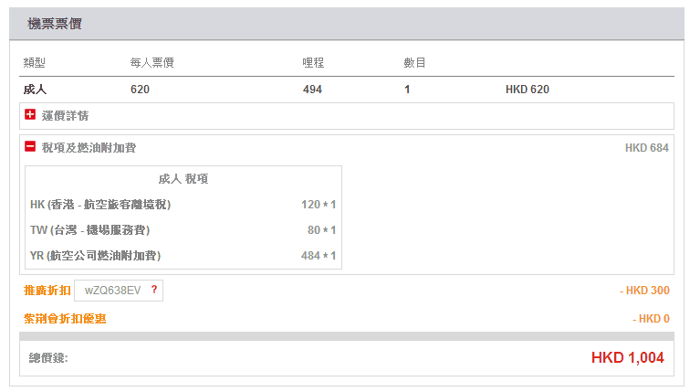 香港往返台北只需$620,減埋週末熱價額外減$300優惠,即係只需$320,連埋稅$1,004,抵到爛