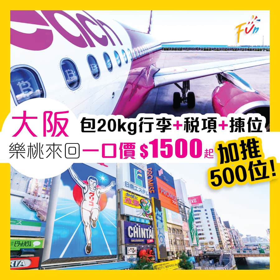 反應熱烈,加推500位!坐樂桃免燃油附加費!3月19日前出發!香港來回大阪一口價 $1,500起,已包來回20kg寄艙行李、稅項及揀位費 – Funfun.travel