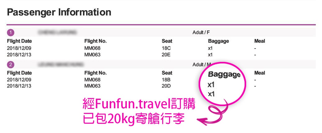 經Funfun.travel網上訂購,價錢已經包咗每人來回各一件20kg寄艙行李+手提行李同揀位錢,平時加來回行李都成$432,即係又慳埋行李費啦!