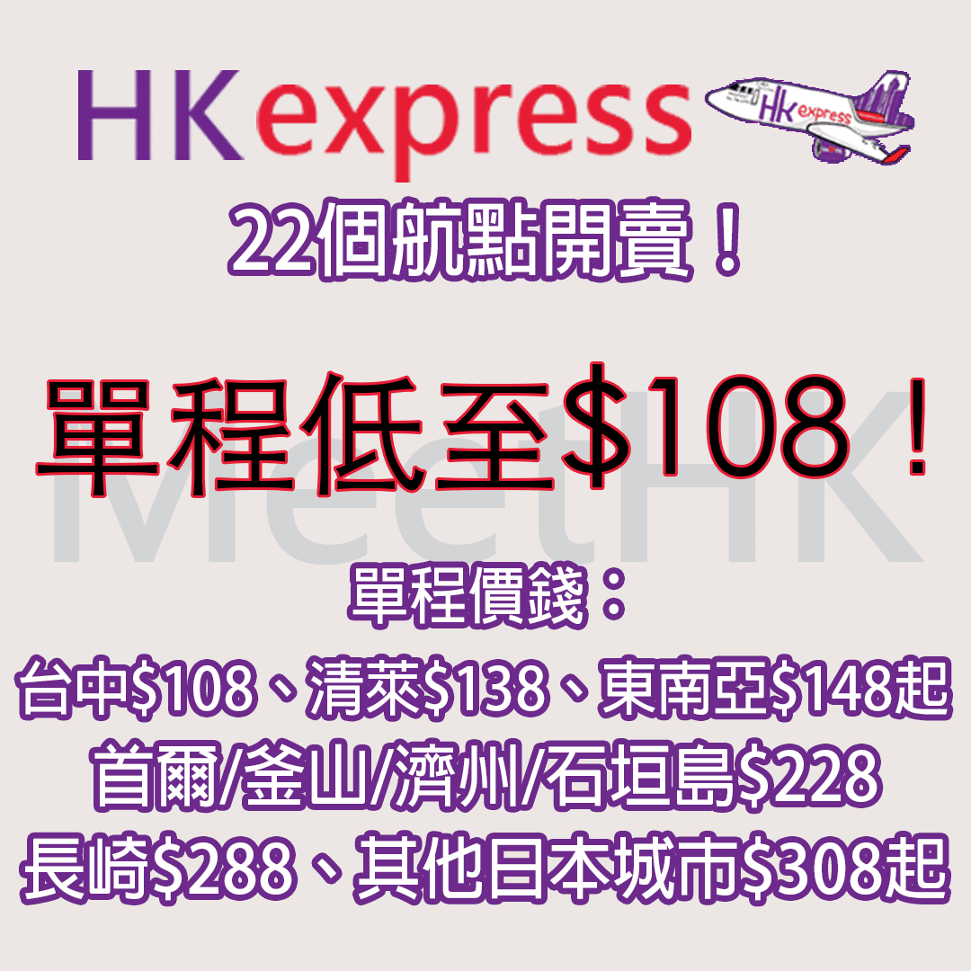 單程低至$108!22個航點!12月16日前出發!香港飛台中單程只需$108、清萊$138、東南亞$148起、首爾/釜山/濟州$228、石垣島$228、長崎$288、其他日本城市$308起 – HK Express (優惠至1月13日)