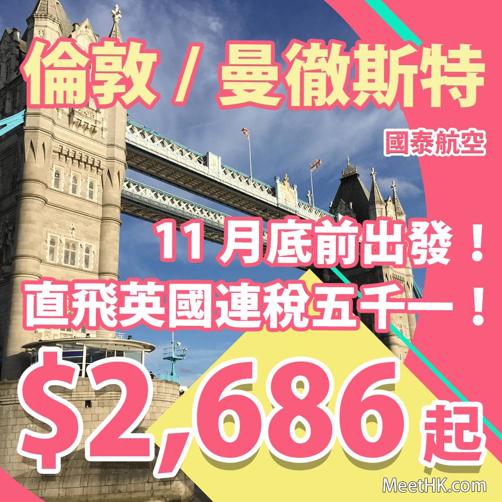 國泰直飛英國優惠!連稅五千一起!11月底前出發!可以Open Jaw!香港直航往返倫敦、曼徹斯特只需$2,686起 – 國泰航空 (優惠至2月4日)