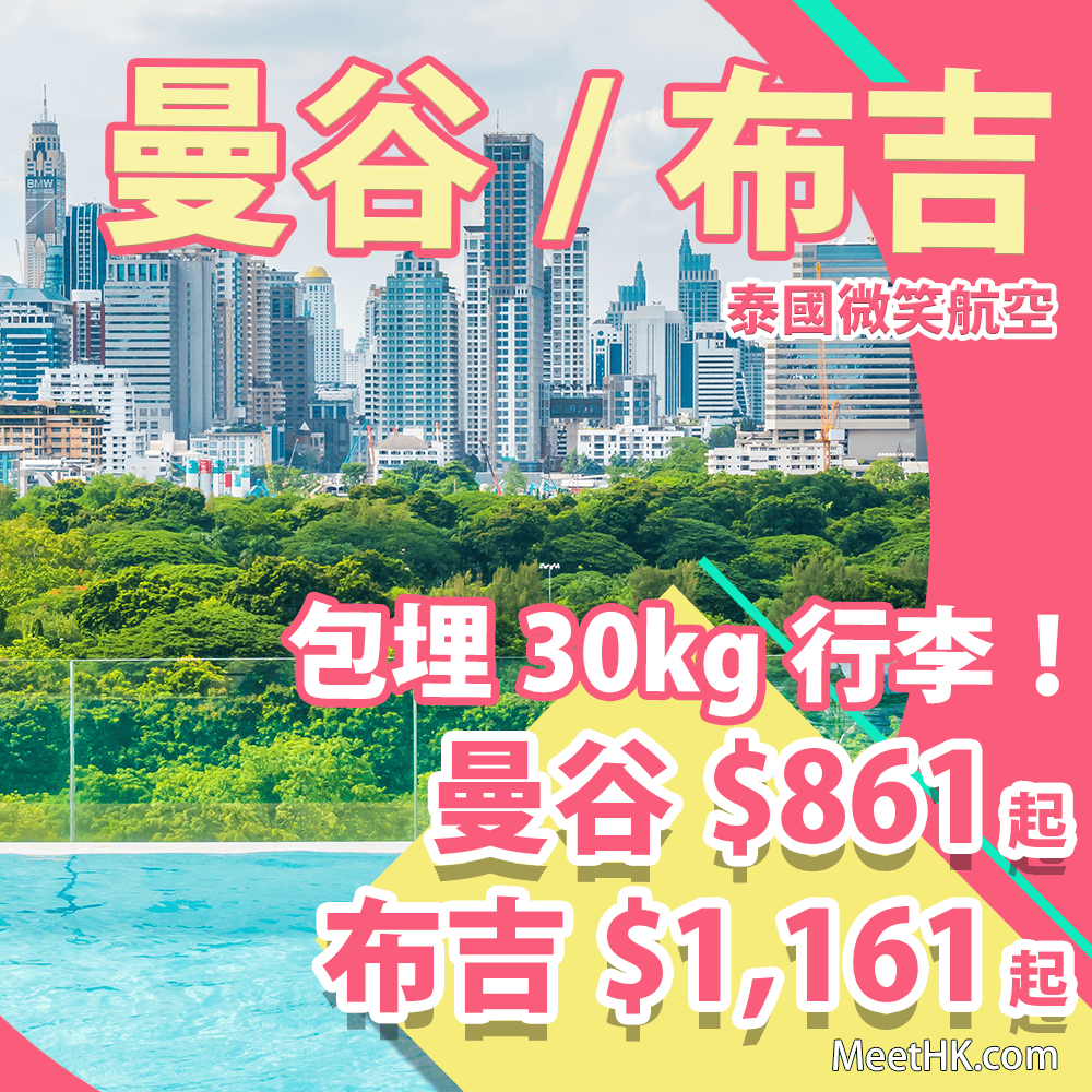 泰國微笑航空平飛等你買!連稅千六飛曼谷!連稅二千直飛布吉!12月20日前出發!包埋30kg行李!香港往返曼谷只需$861起,布吉$1,161起 – 泰國微笑航空 (優惠至2月1日)
