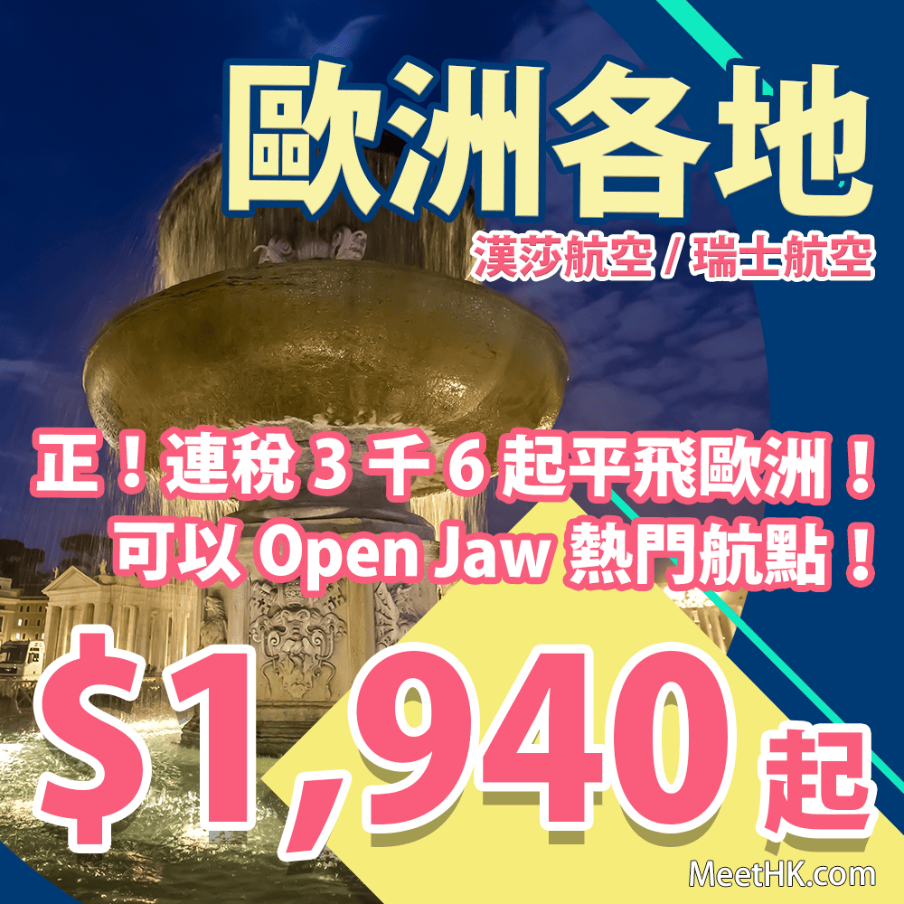 正!連稅3千6起平飛歐洲!可以open jaw玩轉唔同地方!香港往返歐洲各地只需$1,940起 – 漢莎航空/瑞士航空 (優惠至2月11日)