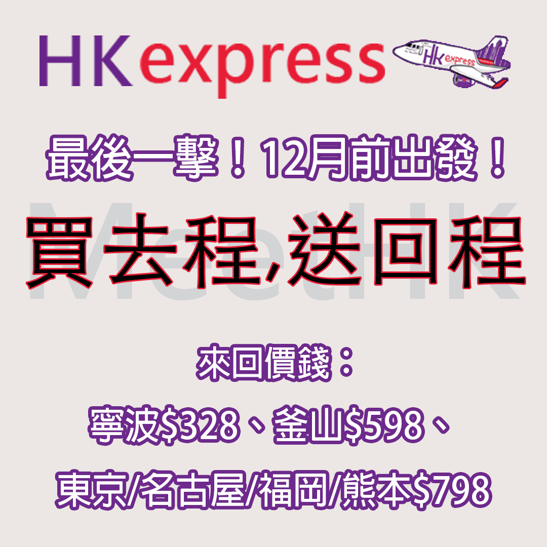 最後一擊!買去程,送回程!12月16日前出發!香港飛寧波來回只需$328、釜山$598、東京/名古屋/福岡/熊本$798 – HK Express (優惠至1月20日)