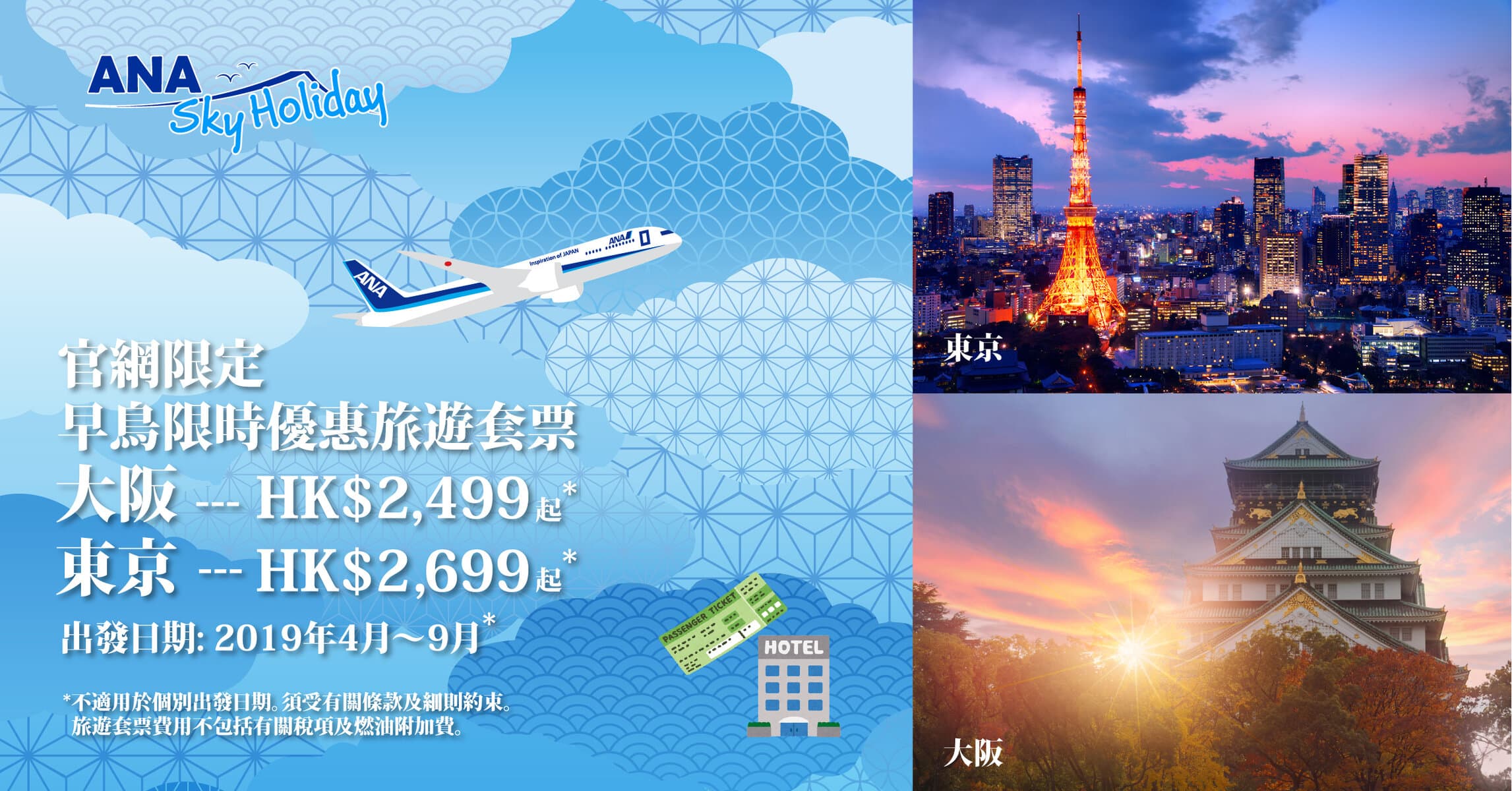 ANA Sky Holiday套票早鳥優惠!趕上櫻花期!仲有2件各23kg行李!9月27日前出發!ANA來回東京/大阪機票+酒店每人只需$2,499起 – ANA Sky Holiday (優惠至1月25日)