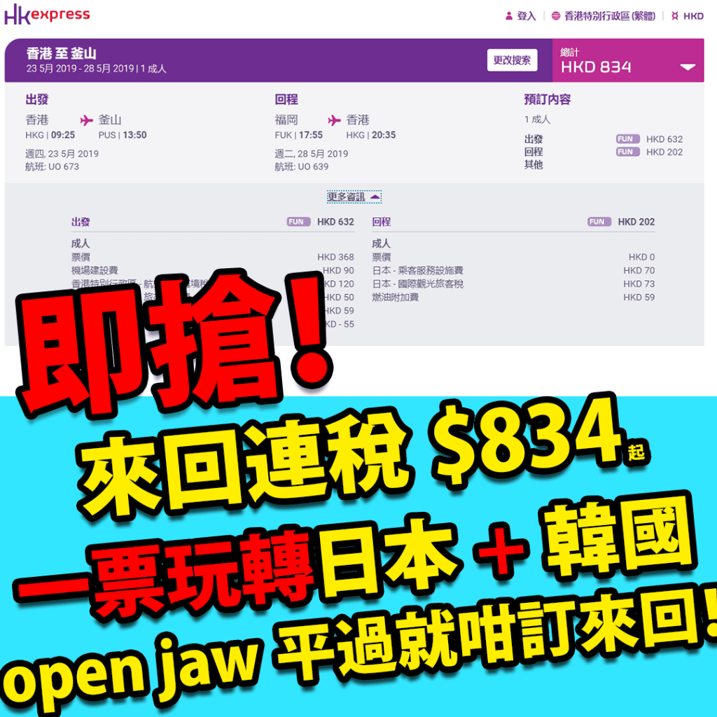 不得了!即搶!連稅$834玩轉日韓!open jaw平過就咁訂來回!韓國open jaw連稅$856起!日本open jaw連稅$934起! – HK Express (優惠至1月20日11:59pm)