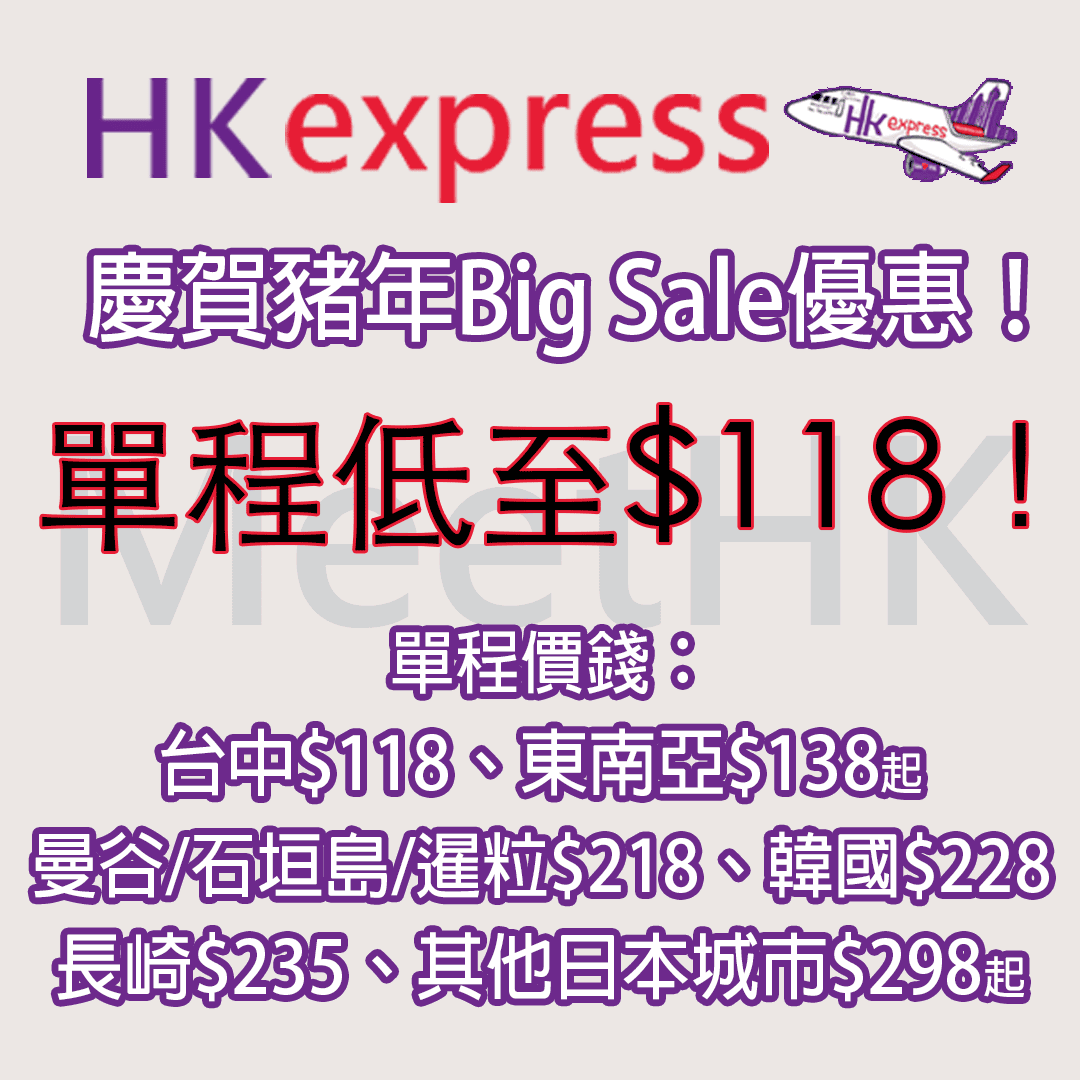 慶賀豬年Big Sale優惠!單程低至$118!23個航點!12月30日前出發!香港飛台中單程只需$118、東南亞$138起、石垣島$218、韓國$228、長崎$235、其他日本城市$298起 – HK Express (優惠至2月3日)