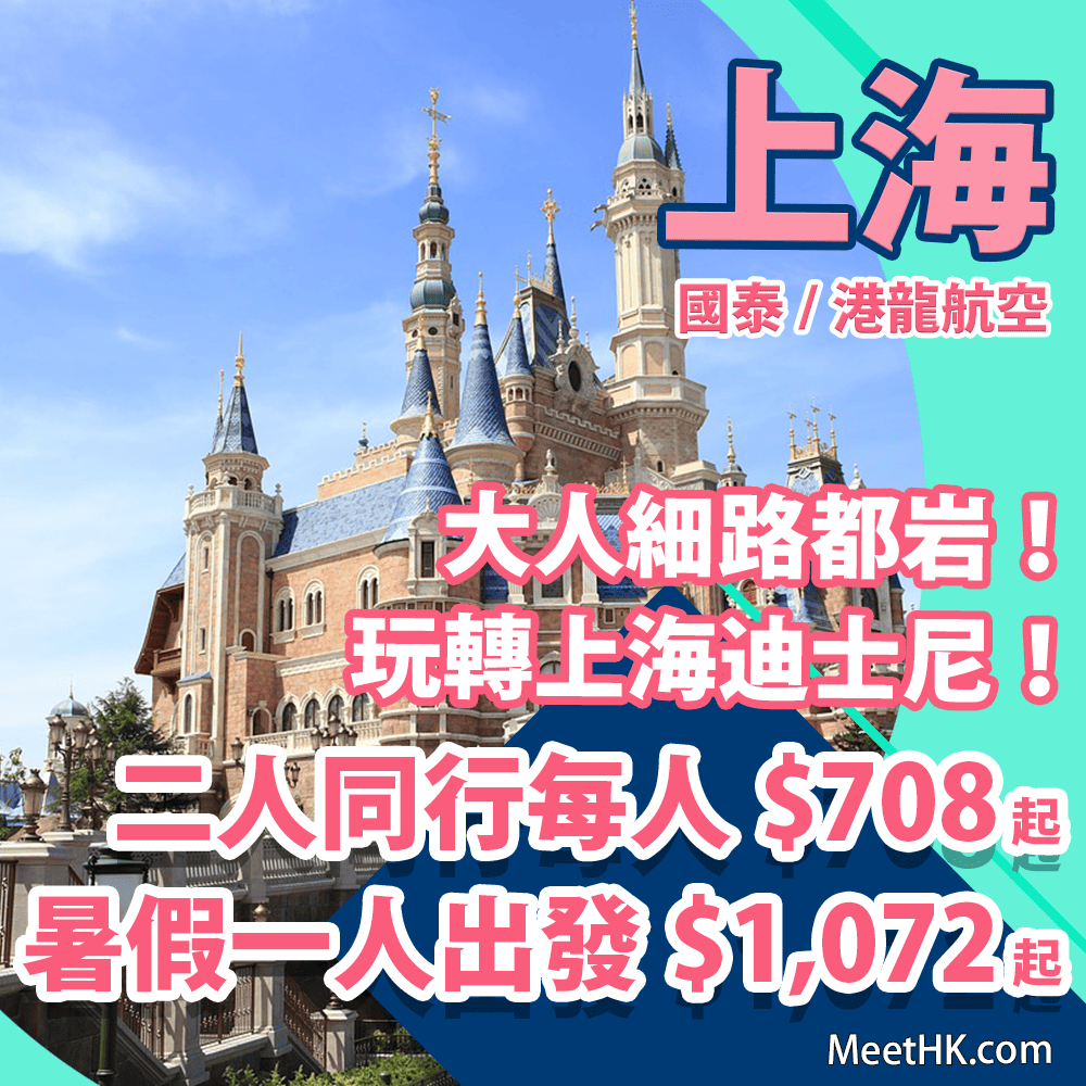 大人細路都岩!玩轉上海迪士尼!暑假都有優惠添!香港往返上海二人同行每人只需$708起,暑假一人出發$1,072起 – 國泰/港龍航空
