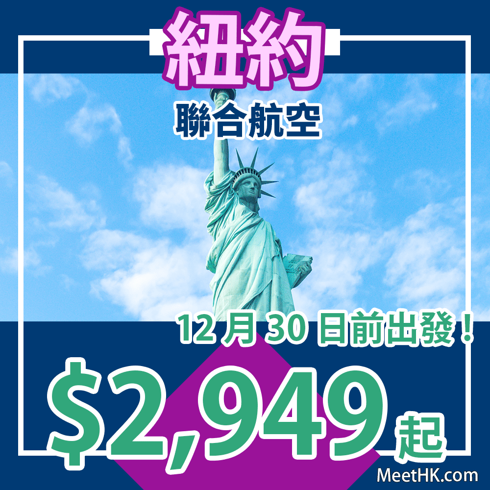 直飛紐約優惠!連稅四千八!跨年出發都得!包2件23kg行李!香港直航往返紐約紐瓦克$2,949起 – 聯合航空 (優惠至7月15日)