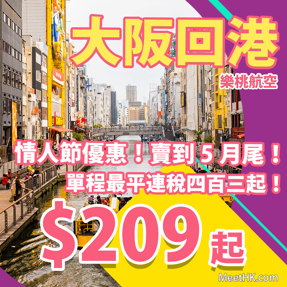 情人節優惠!賣到5月尾!同另一半sweet住大阪返香港!連稅四百三起!大阪飛香港單程只需$209起 – 樂桃航空 (優惠至2月14日11pm)