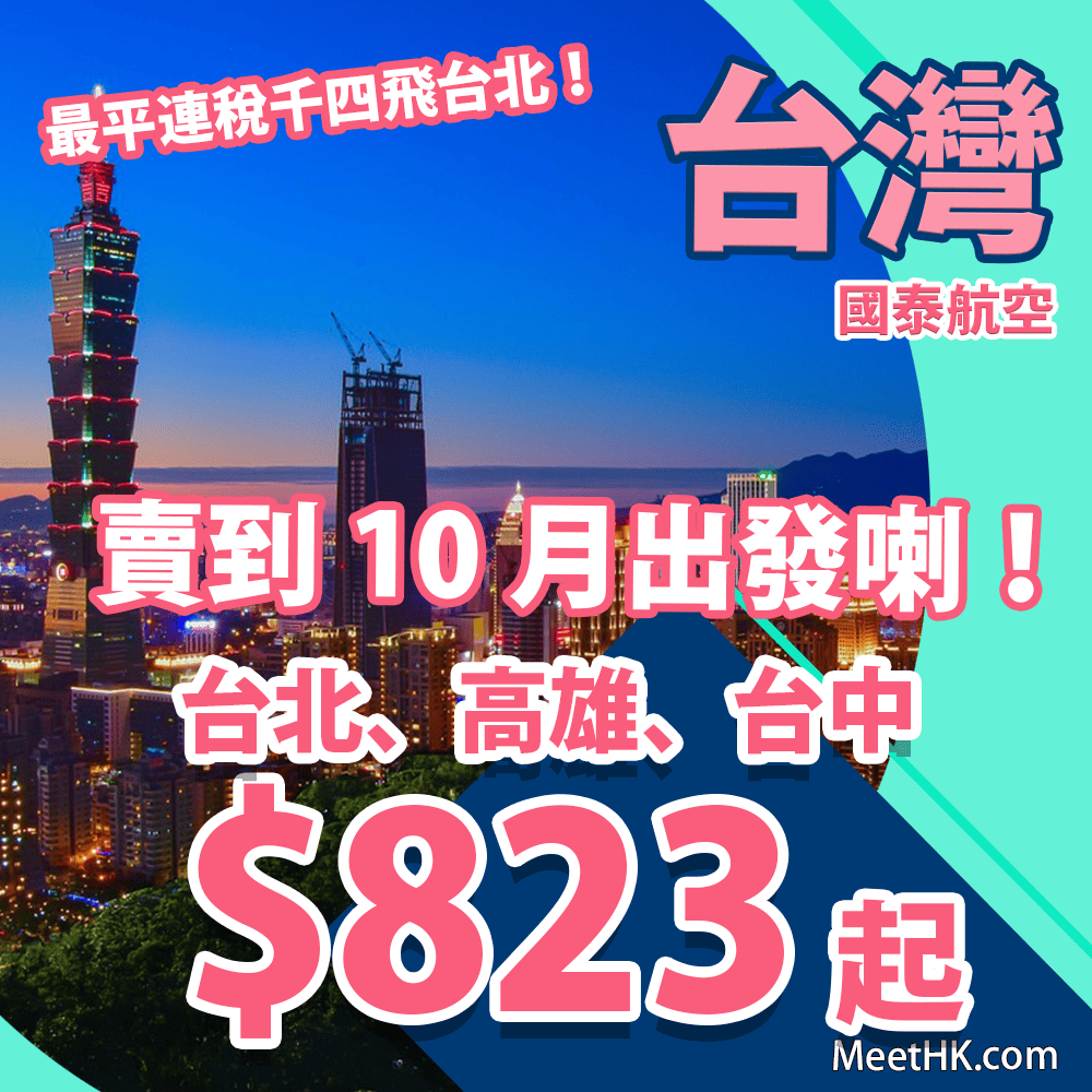 香港往返台北、高雄來回只需$823起,連稅$1,441起 (2月至4月出發)