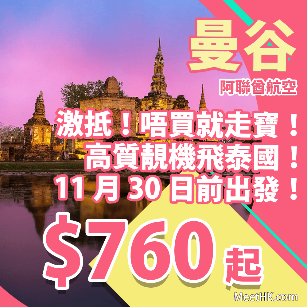 香港往返曼谷只需$760起,連稅$1,289起,真係超抵!