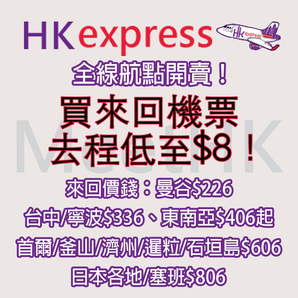 買來回機票,去程$8!全線航點開賣!香港飛曼谷來回只需$226、台中/寧波$336、東南亞$406起、首爾/釜山/濟州/石垣島$606、日本各地/塞班$806 – HK Express (優惠至2月17日)