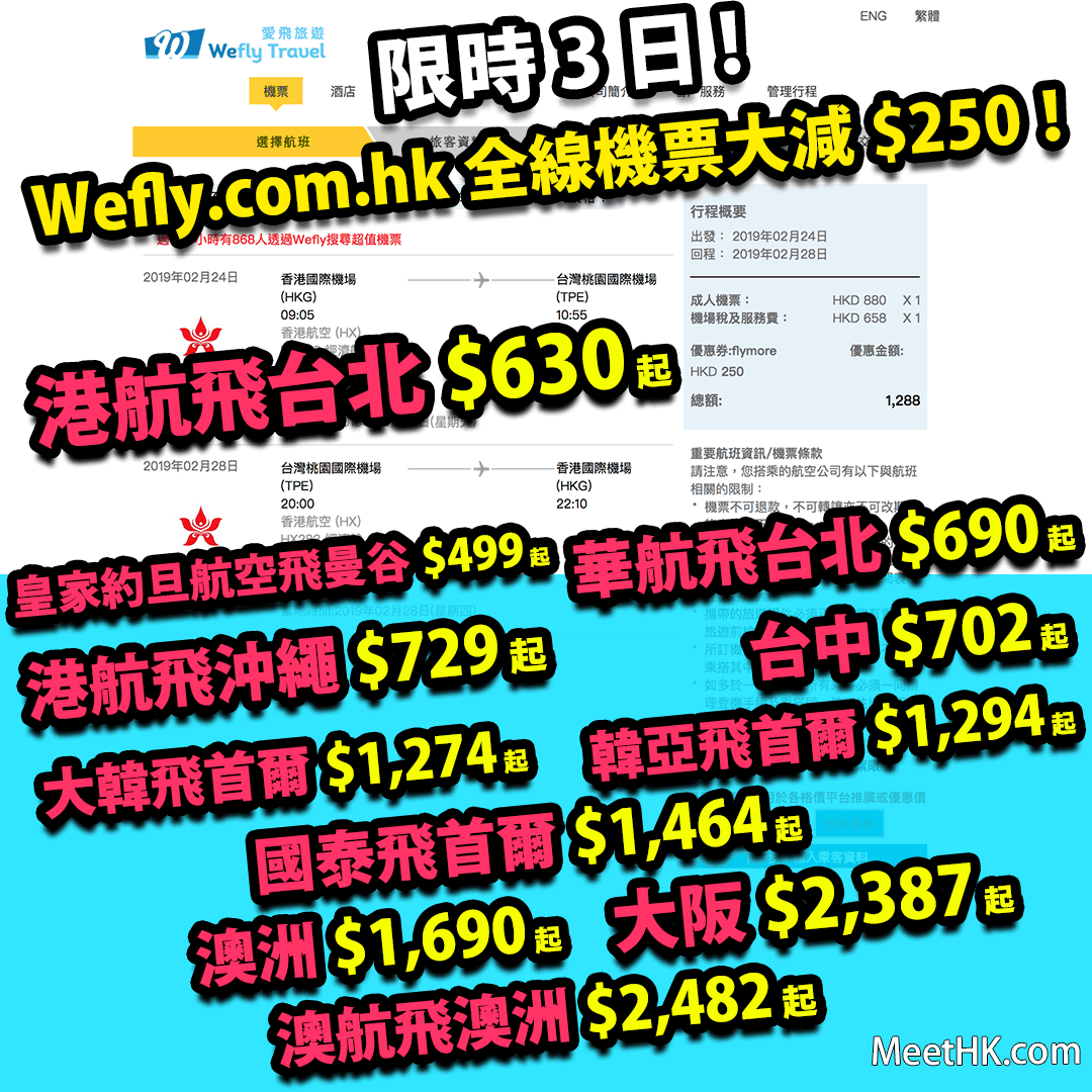 限時3日!全線機票每張減$250!皇家約旦航空飛曼谷$499起,港航飛台北$630起,沖繩$729起,華航飛台北$690起,台中$702起,大韓飛首爾$1,274起,國泰飛首爾$1,464起,澳洲$1,690起,大阪$2,387起,澳航飛澳洲$2,482起 – Wefly.com.hk (優惠至2月14日)