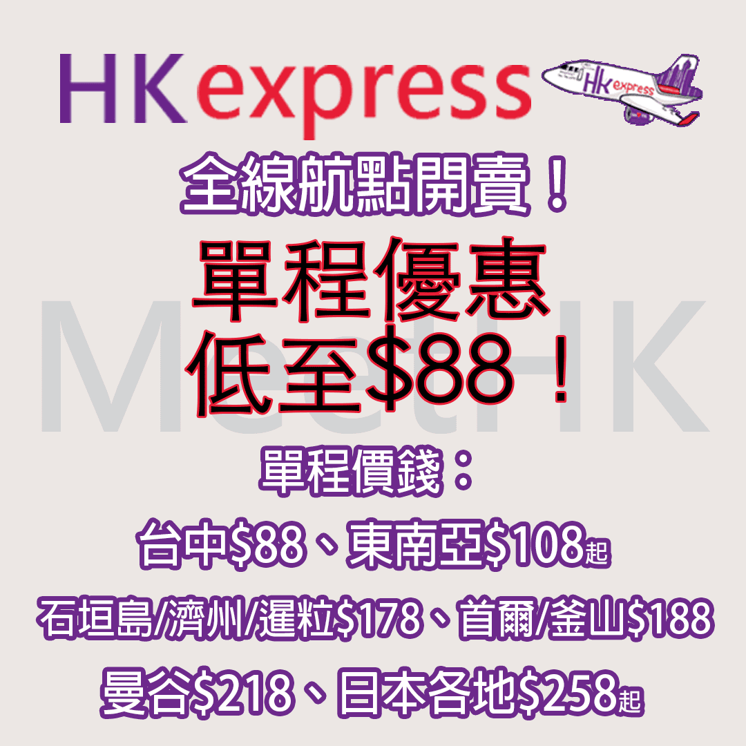 單程低至$88!全線航點開賣!香港飛台中單程只需$88、東南亞$108起、石垣島/濟州$178、首爾/釜山$188、曼谷$218、日本各地$258起 – HK Express (優惠至2月24日)