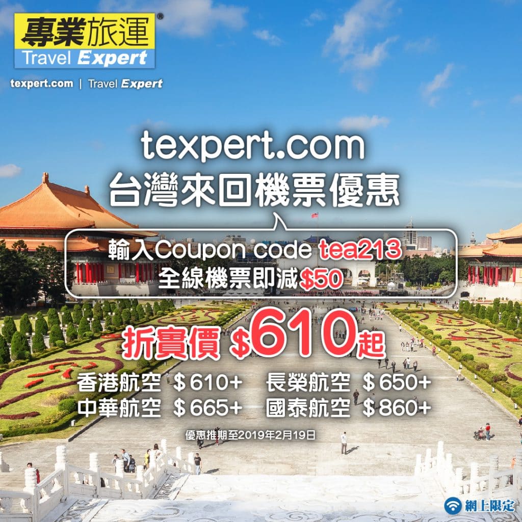 專業旅運texpert.com網上限定台灣優惠!港航飛台北$610起,長榮飛台北$650 起,華航飛台灣$665起,國泰飛台灣$860起 – 專業旅運 (優惠至2月19日)