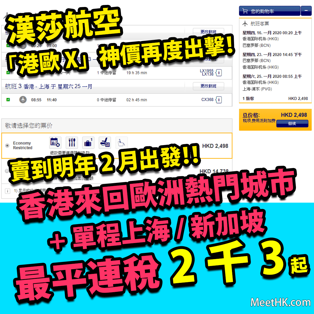 搶搶搶!「港歐X」神價再度出擊!最平連稅2千3起!來回歐洲+單程飛上海/新加坡!賣到明年2月出發!香港往返歐洲各地連稅只需$2,376起 – 漢莎航空