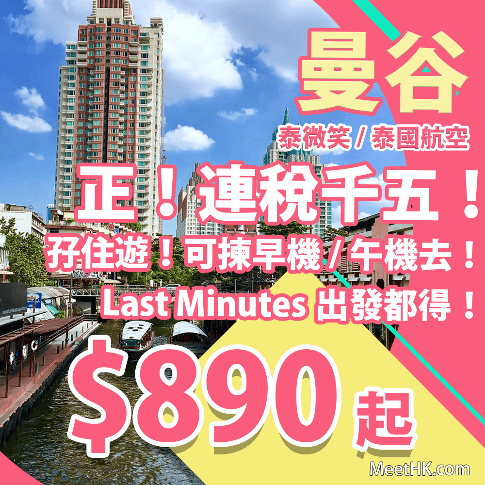 香港往返曼谷二人同行每人只需$890起,連稅$1,567起