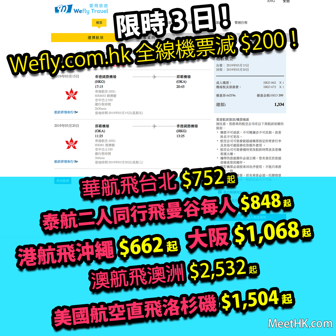 限時3日!全線機票每張減$200!華航飛台北$752起,泰航飛曼谷$848起,港航飛沖繩$662起、大阪$1,068起,澳航飛澳洲$2,532起,美航飛洛杉磯$1,504起 – Wefly.com.hk (優惠至2月21日)