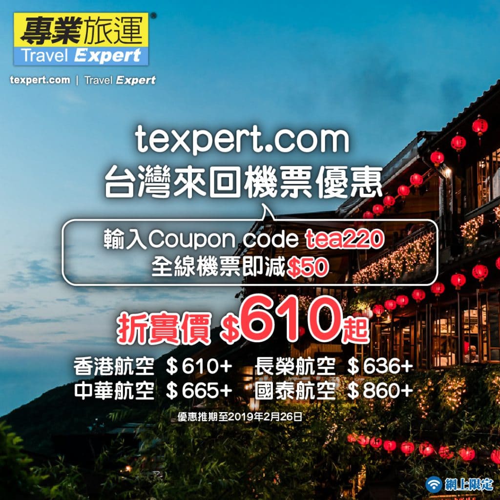 專業旅運texpert.com網上限定台灣優惠!港航飛台北$610起,長榮飛台北$636 起,華航飛台灣$665 起,國泰飛台灣$860起!仲有噴射飛航來回澳門船票$268起! – 專業旅運 (優惠至2月26日)