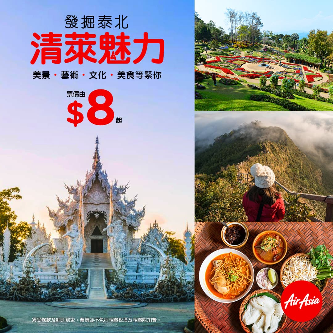激抵!$8!$8!$8!澳門直飛泰北清萊單程只係$8起!今年新開航線!7月31日前出發!澳門直飛清萊來回連稅$354起 – AirAsia (優惠至3月3日)