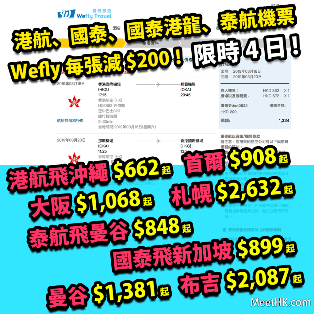 限時4日!港航/國泰/港龍/泰航減$200優惠!港航飛沖繩$662起,首爾$908起,大阪$1,068起,札幌$2,632起,泰航飛曼谷$848起,國泰飛新加坡$899起,曼谷$1,381起,布吉$2,087起 – Wefly.com.hk (優惠至2月25日)
