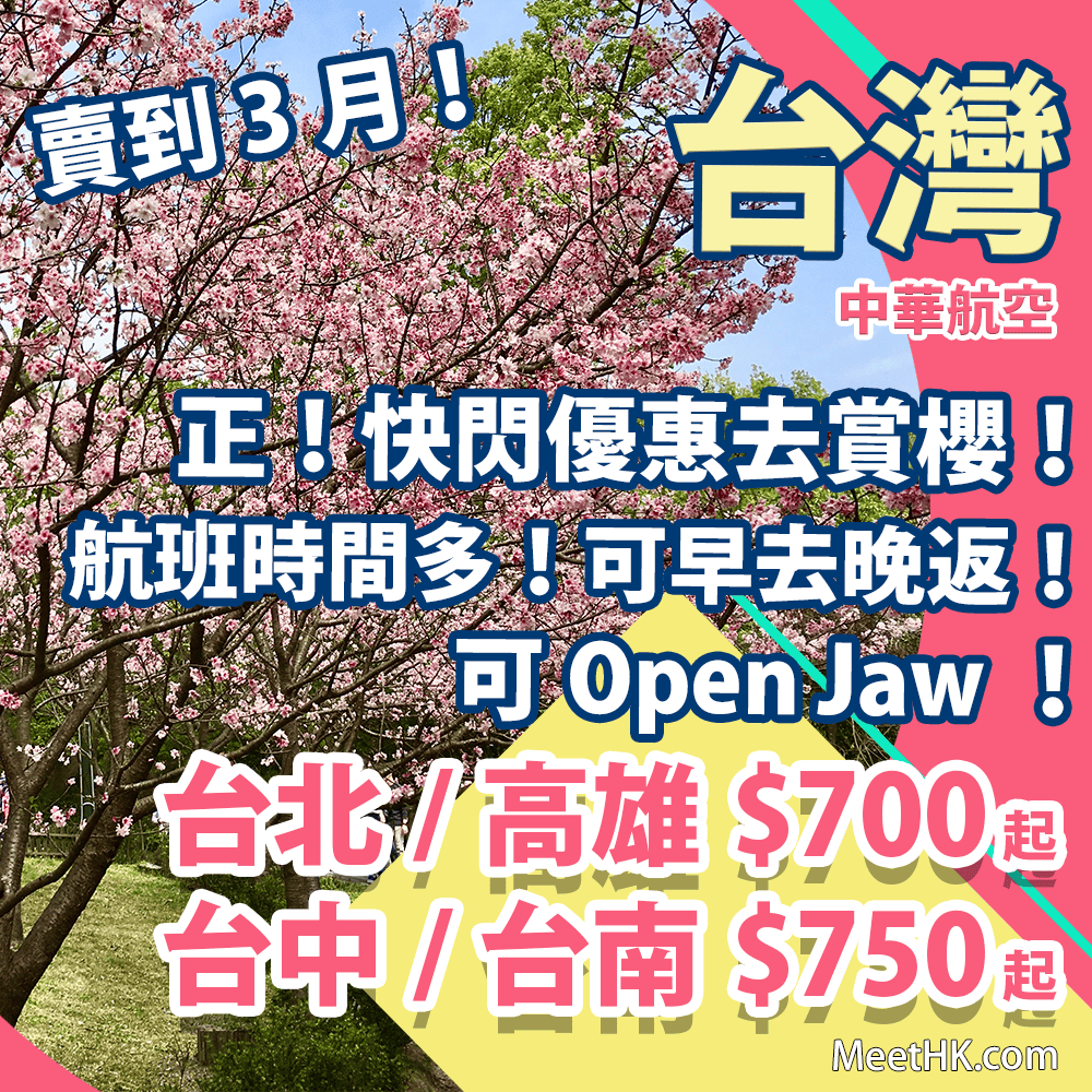 正!快閃優惠!華航飛台灣減啦!最平連稅千二蚊!航班時間多!可早去晚返!可Open Jaw!香港往返台北/高雄$700起,台中/台南$750起 – 中華航空 (優惠至2月27日11pm)