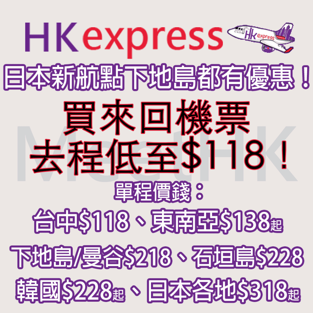 單程低至$118!24個航點開賣!香港飛台中單程只需$118、東南亞$138起、下地島/曼谷$218、石垣島$228、韓國$228起、日本各地$318起 – HK Express (優惠至3月3日)