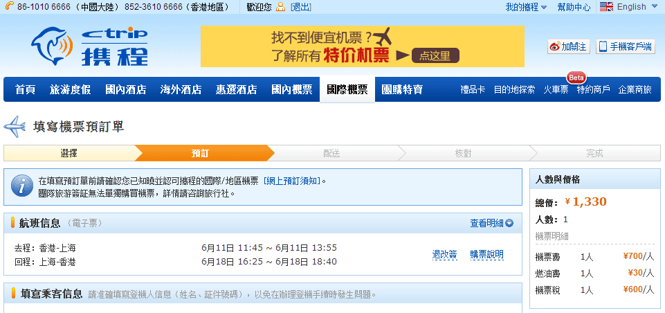 呢隻優惠大家可去 攜程旅行網 Ctrip 查一下航班機位和訂購。