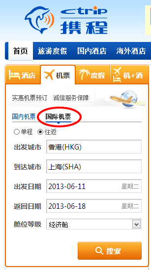 http://www.ctrip.com (選機票預訂-國際機票)
