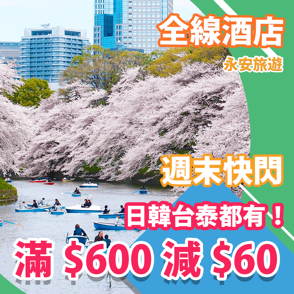 週末快閃!全線酒店減減減!全線酒店滿$600即減$60!熱門地點日韓台泰都有!精選酒店每晚$288起 – 永安旅遊 (優惠至3月3日)