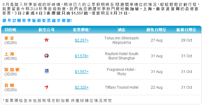 想避開爭機位的情況,輕輕鬆鬆計劃行程,就要留意今期ZUJI秋季旅遊熱賣。網羅秋季熱門勝地新加坡、上海、東京及首爾的最優惠套票,3日2夜或4日3夜價錢只由$1,557起,優惠期至8月31日。