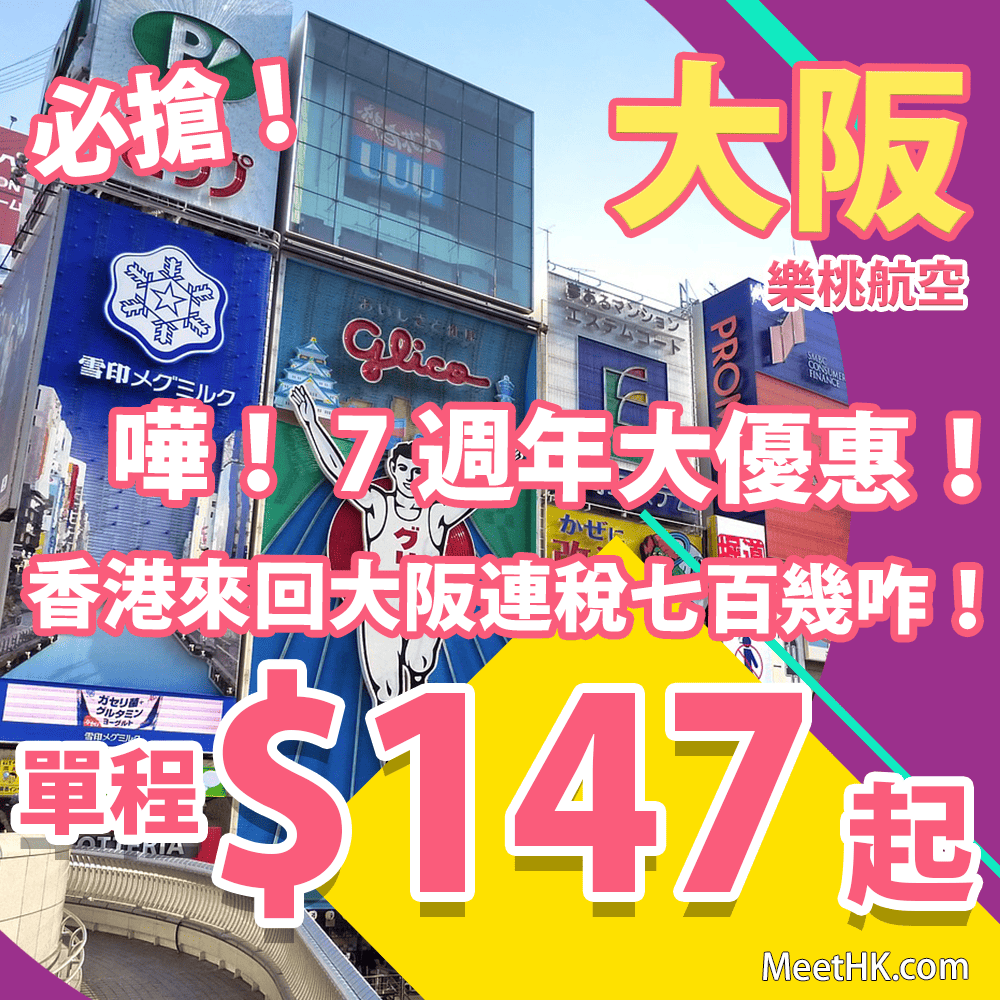 嘩嘩嘩!單程低至$147!來回大阪連稅七百幾咋!今年新低!樂桃7週年優惠搶搶搶!香港飛大阪單程只需$147起 – 樂桃航空 (優惠至3月8日)