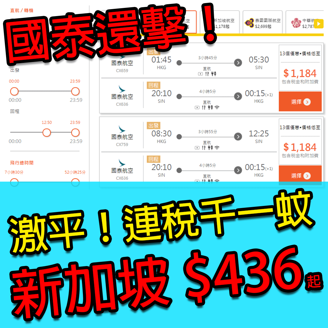 嘩嘩嘩!$436飛獅城!優惠真係停不了!國泰出招還擊新航!連稅千一蚊咋!