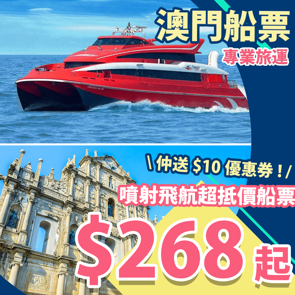 限時加推!噴射飛航超抵價船飛!網上限定!噴射飛航來回香港至澳門船票只需$268起!仲送$10優惠券!– 專業旅運 (優惠至3月17日)