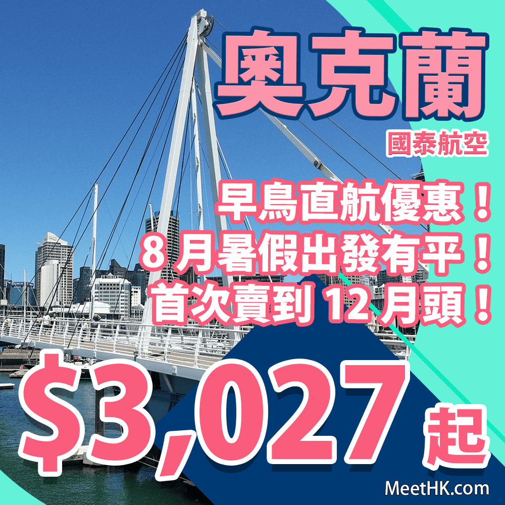國泰早鳥優惠!飛新西蘭連稅4千6!首次賣到12月!香港直航往返奧克蘭只需$3,027起 – 國泰航空 (優惠至3月18日)