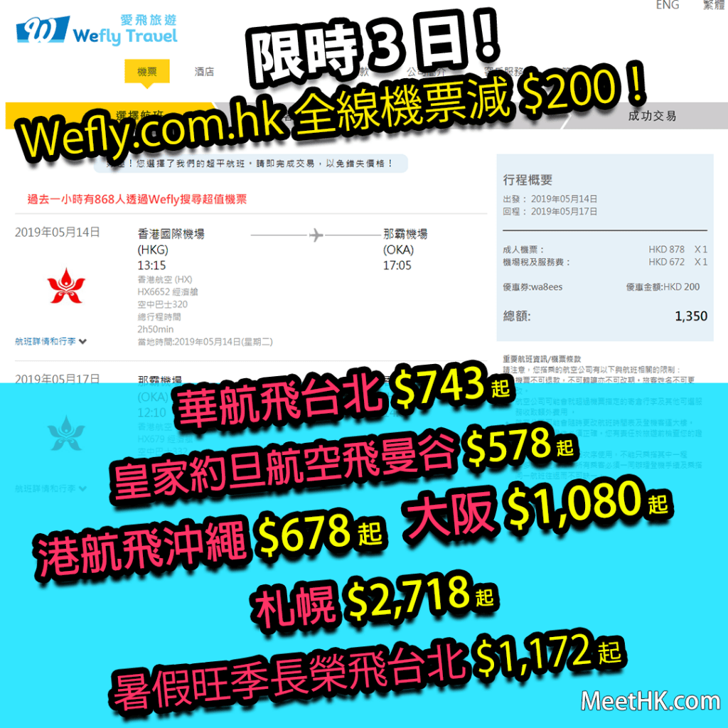 限時3日!全線機票每張減$200!港航飛沖繩$678起,大阪$1,080起,札幌$2,718起,皇家約旦航空飛曼谷$578起,華航飛台北$743起,暑假旺季長榮飛台北$1,172起,暑假旺季大韓飛首爾$1,710起 – Wefly.com.hk (優惠至3月20日)