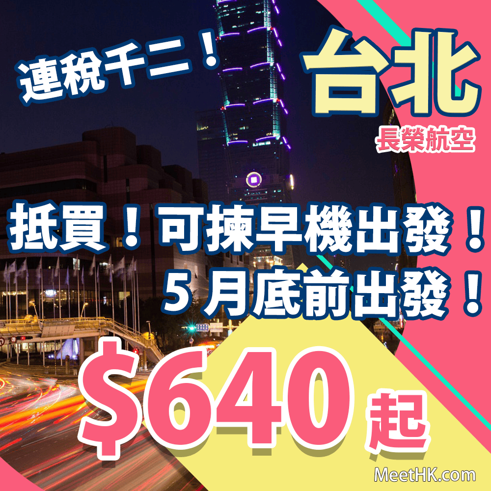 抵買!長榮飛台北激減!連稅千二蚊!5月31日前出發!30kg行李!香港往返台北只需$640起 – 長榮航空 (優惠至3月21日)