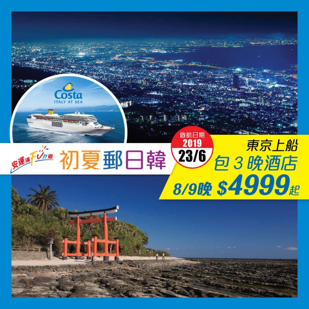 安運滿Fun遊推出日韓郵輪限時夏日優惠!包香港來回日韓機票+5/6晚歌詩達新浪漫號船上食宿+2晚東京+1晚釜山/福岡酒店!