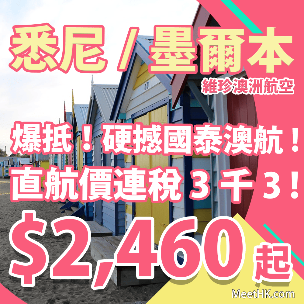嘩!維珍澳洲硬撼國泰同澳航!連稅3千3起直飛澳洲!爆抵!香港往返悉尼/墨爾本只需$2,460起 – 維珍澳洲航空 (優惠至3月31日)