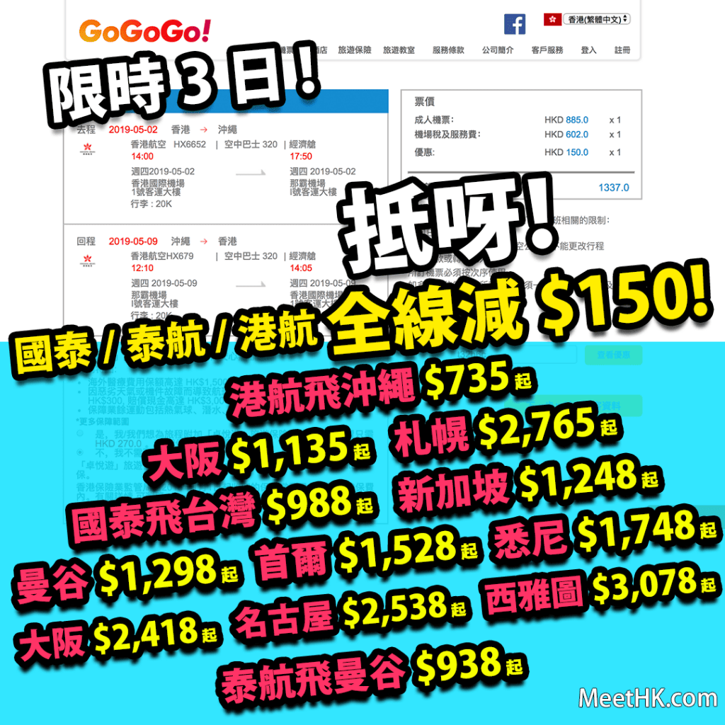 限時3日!國泰/泰航/港航全線減$150!名額200個!港航飛大阪$1,135起,札幌$2,765起、國泰飛台北$988起,新加坡$1,248起,曼谷$1,298起,首爾$1,528起,悉尼$1,748起,大阪$2,418起,名古屋$2,538起,西雅圖$3,078起、泰航飛曼谷$938起 – GoGoGo (優惠至3月24日)