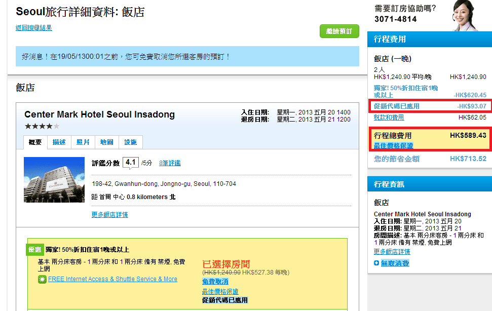 岩岩今日HotelClub同RatesToGo推出左Center Mark Hotel Seoul Insadong限時72小時優惠
