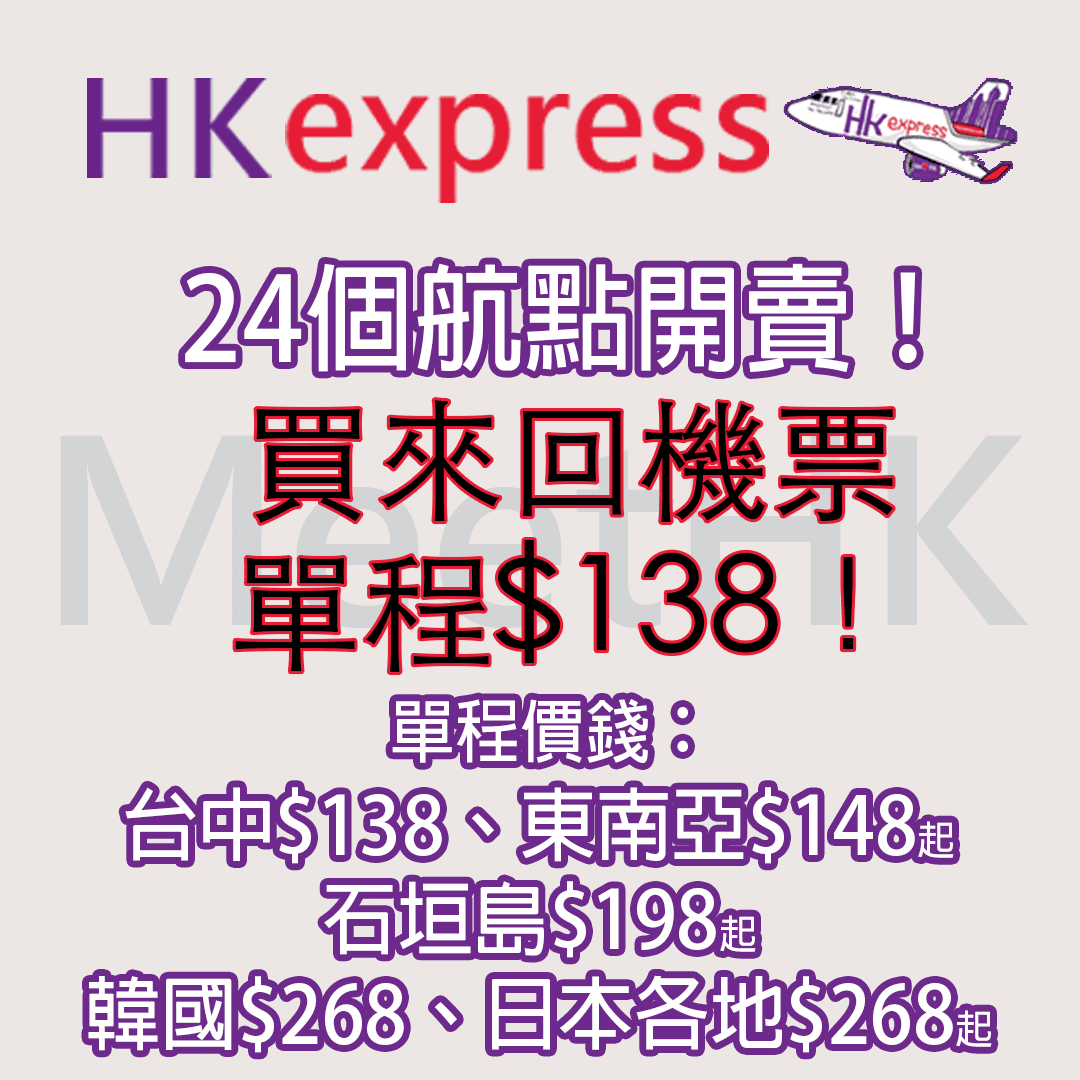 買來回機票單程低至$138!24個航點開賣!香港飛台中單程只需$138、東南亞$148起、石垣島$198、韓國$268、日本各地$268起 – HK Express (優惠至4月7日)