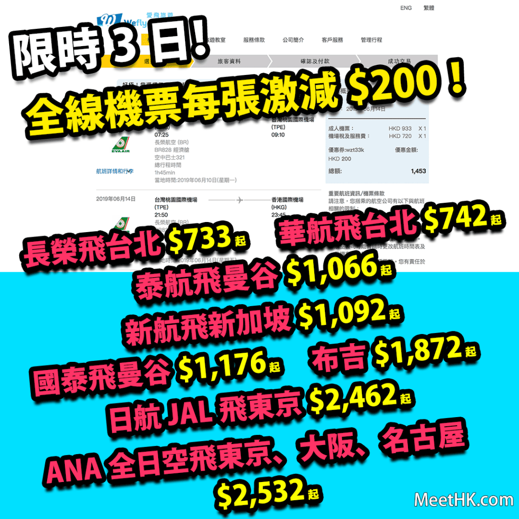 限時3日!全線機票每張減$200!長榮飛台北$733起,華航飛台北$742起,泰航飛曼谷$1,066起,新航飛新加坡$1,092起,國泰飛曼谷$1,176起,布吉$1,872起,日航JAL飛東京$2,462起,ANA全日空飛東京/大阪/名古屋$2,532起 – Wefly.com.hk (優惠至4月4日)