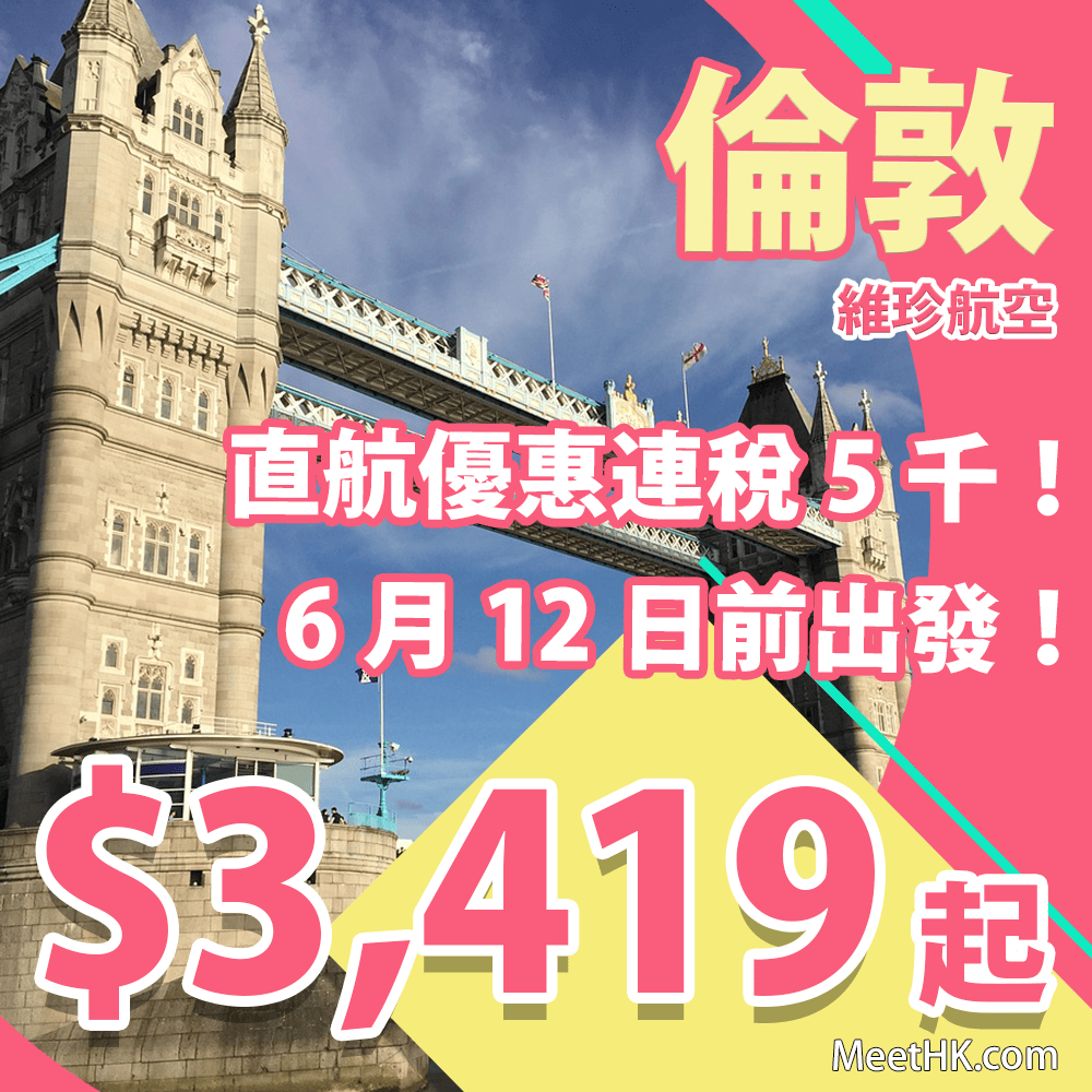 坐維珍直航倫敦優惠!減減減!連稅5千!包23kg行李!6月12日前出發!香港直飛往返倫敦只需$3,419起 – 維珍航空 (優惠至4月9日)