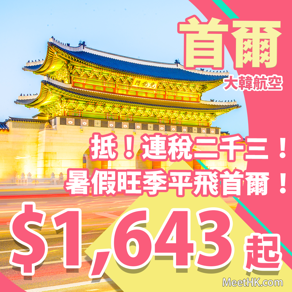 抵!暑假旺季坐大韓飛首爾!連稅二千三!可凌晨機去晚機返!香港往返首爾只需$1,643起 – 大韓航空 (優惠至4月30日)