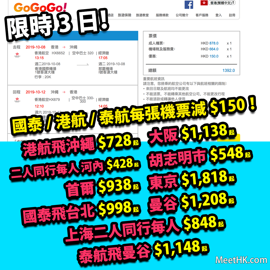 限時3日!名額200個!國泰/港航/泰航每張機票減$150!港航唔少航點有平!港航飛沖繩$728起,大阪$1,138起,河內$428起,胡志明市$438起,首爾$938起,東京$1,818;國泰飛台北$998起,曼谷$1,208起,上海$848起;泰航飛曼谷$1,148起 – GoGoGo (優惠至4月15日)