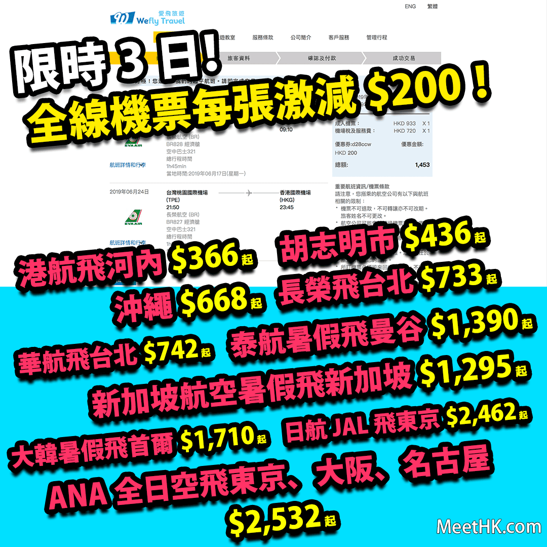 限時3日!全線機票每張減$200!港航飛沖繩$668起,長榮飛台北$733起,華航飛台北$742起,新航暑假飛新加坡$1,295起,泰航暑假飛曼谷$1,390起,大韓暑假飛首爾$1,710起,ANA全日空飛東京/大阪/名古屋$2,532起、日航JAL飛東京$2,462起 – Wefly.com.hk (優惠至4月17日)